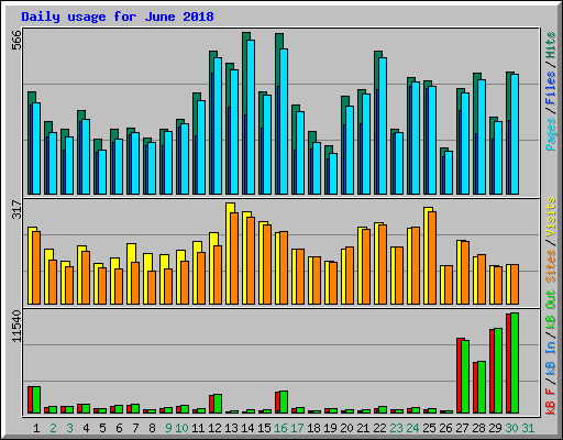 | Day | Hits | Files | Pages | Visits | Sites | kB F | kB In | kB Out | ||||||||